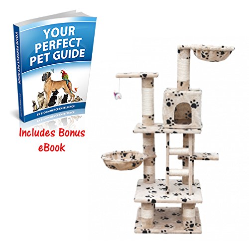 All images of Unique Cat Play Tree In Beige With Black Paw Prints Entirely Covered With Very Soft Plush - Will Provide Your Cat With Its Own Slice Of Paradise In Your Home By eCommerce Excellence.